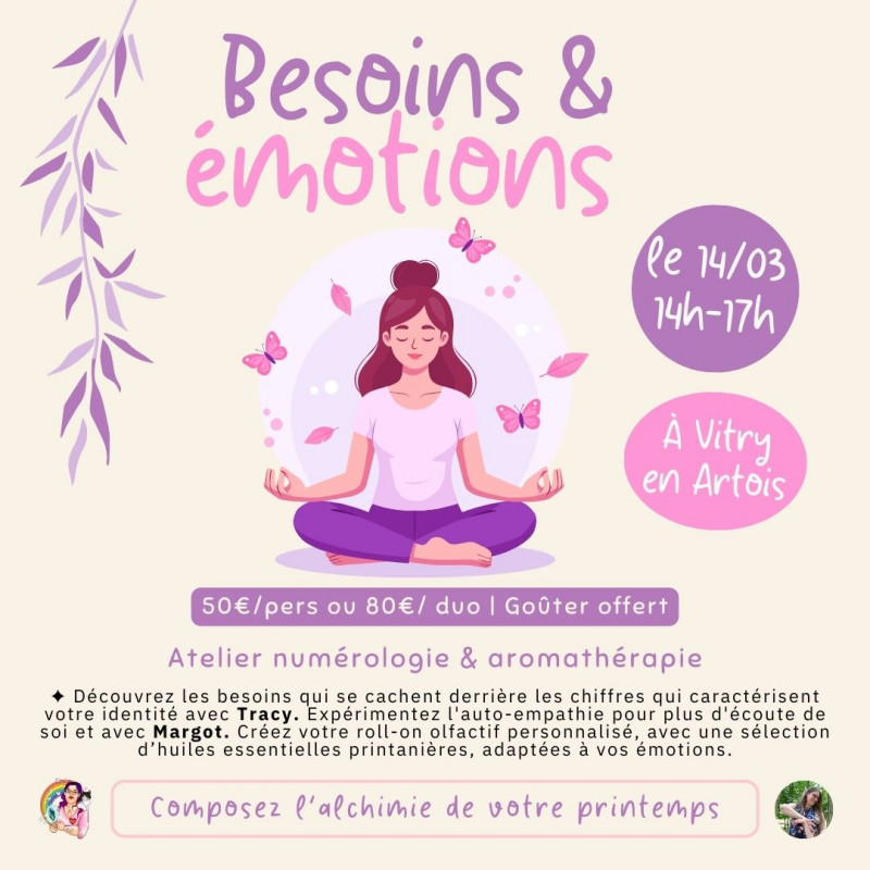 « Besoin et émotions : composer l'alchimie de votre printemps » - Atelier numérologie & olfacto-thérapie : découvrez les besoins qui se cachent derrière les chiffres qui composent votre identité, expérimentez l'auto-empathie pour plus d'écoute de soi et créez votre roll-on olfactif personnalisé et sur-mesure aux huiles essentielles printanières et adaptées à vos émotions.